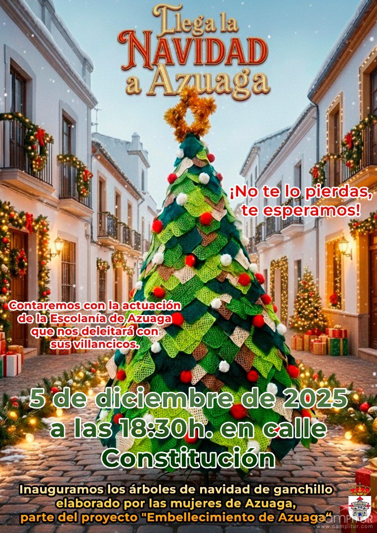 Azuaga se prepara para vivir esta tarde uno de los momentos más especiales del calendario festivo: la inauguración oficial de la Navidad 2025. El acto se celebrará hoy, 5 de diciembre, a partir de las 18:30 horas, en la céntrica calle Constitución, donde vecinos y visitantes podrán disfrutar del encendido y presentación de los originales árboles de Navidad elaborados en ganchillo, confeccionados por las mujeres del municipio dentro del proyecto “Embellecimiento de Azuaga”.