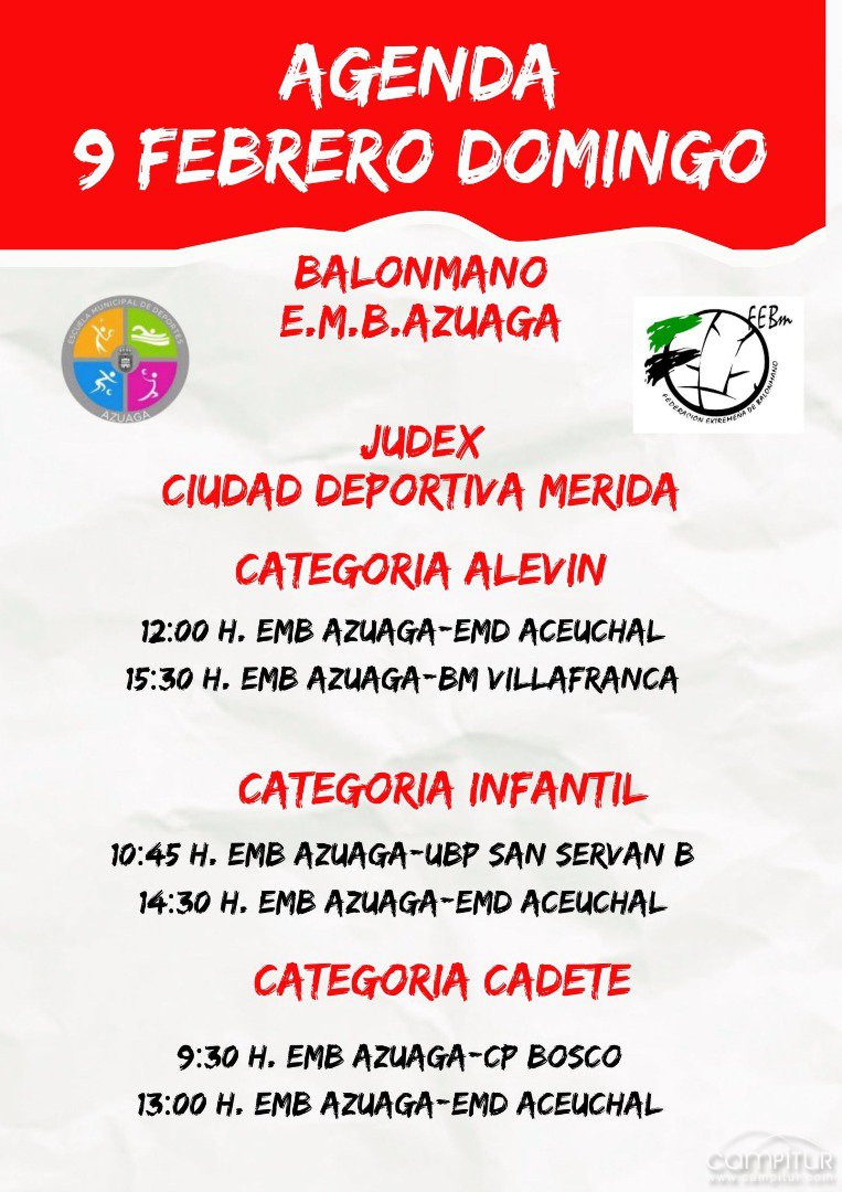 La jornada del domingo 9 de febrero estará marcada por la participación de la E.M.B. Azuaga en los JUDEX de Balonmano, que se celebrarán en la Ciudad Deportiva de Mérida. Los partidos programados son: