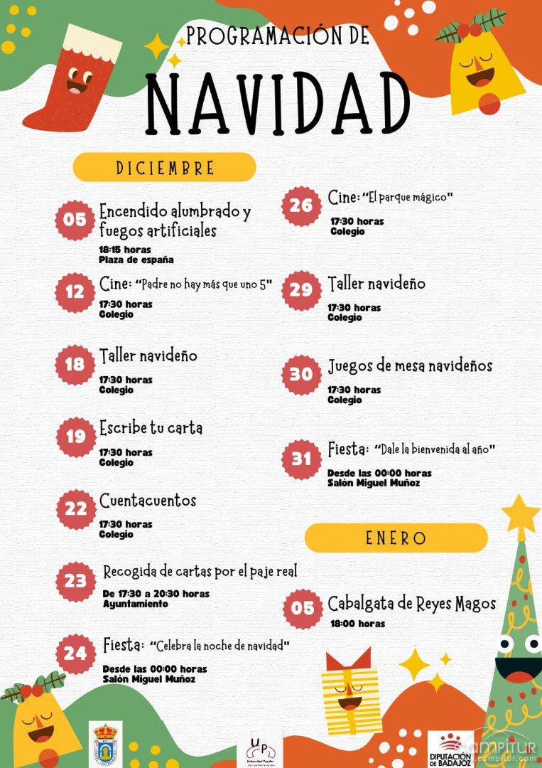El Ayuntamiento de Fuente del Arco ha dado a conocer su completa programación de Navidad 2025, un calendario repleto de actividades dirigidas a niños, jóvenes y familias que se desarrollará entre los meses de diciembre y enero. Con propuestas culturales, lúdicas y festivas, el municipio se prepara para vivir unas semanas llenas de ambiente navideño y participación vecinal.